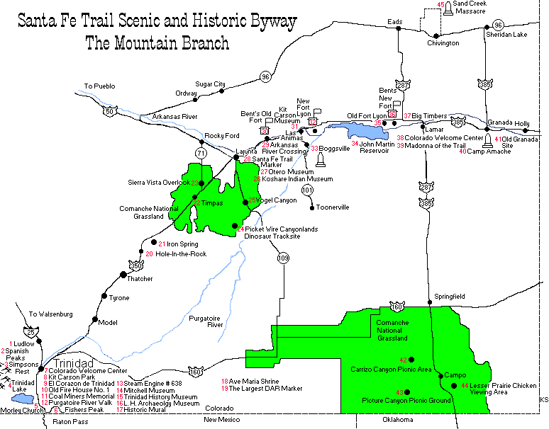 The Mountain Branch of the Santa Fe Trail is a unique tapestry of mountains, plains and fertile farmlands. Our history and heritage is part Western frontier, part pioneer and part Old Mexico. Whether you choose to spend your time enjoying Victorian cityscapes or outdoor recreation that takes full advantage of our Byways abundant resources, we'll do our best to make you feel at home on your vacation. Go duck, deer antelope and wild turkey hunting, shopping for antiques, fishing for trout (or big bass), digging for history -- The Mountain Branch has something for everyone. Listen to mountain or Blues music, tour Army Fort sites, visit art, historic or children's museums, watch for eagles or make an eagle -- and don't forget to attend one of the fun family festivals held annually! Our restaurant menus are as diverse as our regional attractions. Explore each and every one of our Byways three regions, our 45 points of interest, a particular city or a specific lake or river using the links on our site map. The Mountain Branch is mighty accommodating!